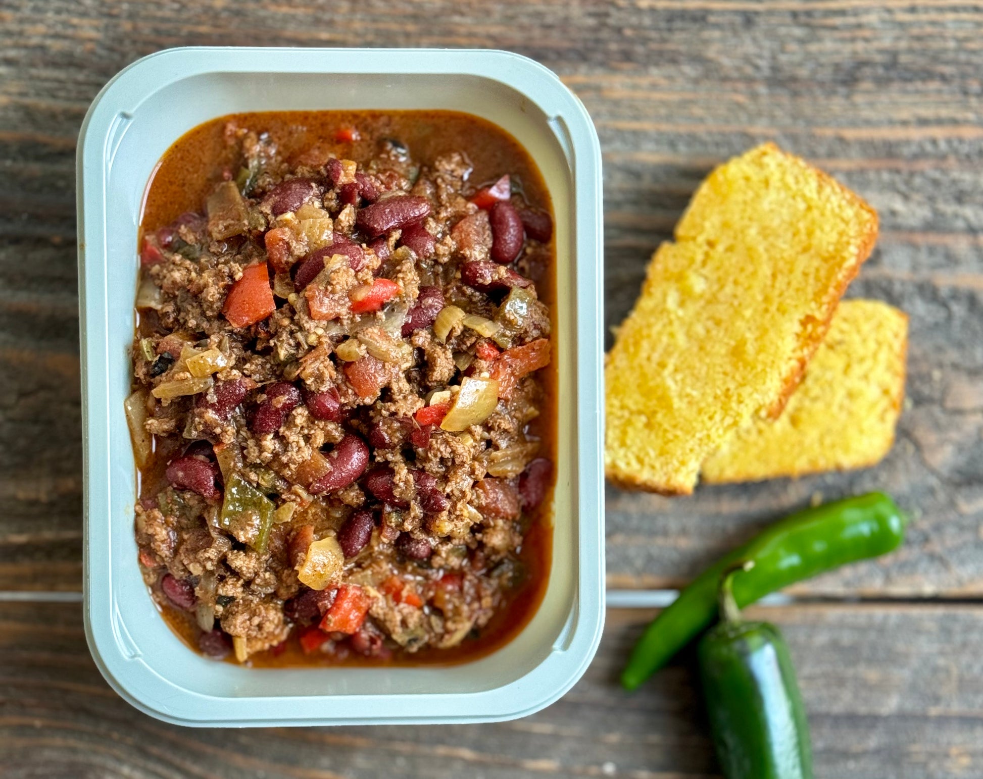 Grimaldi Farm grass-fed organic beef chili. Made with fresh chilis, kidney beans, tomatoes, and spices. Served with a side of our house cornbread This contains dairy and gluten.