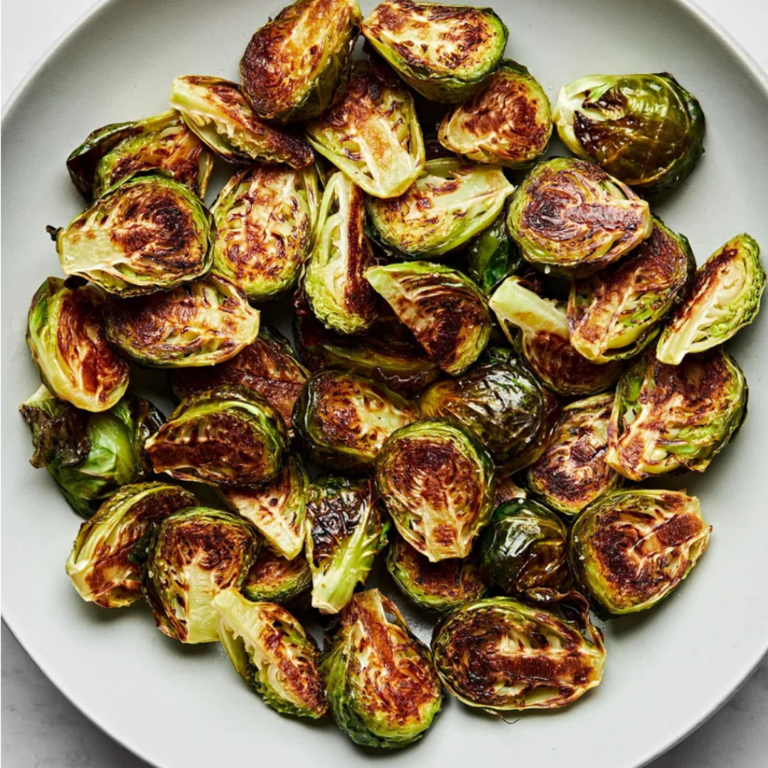 Roasted brussel sprouts tossed in olive oil and garlic confit. This is vegan and gluten free.